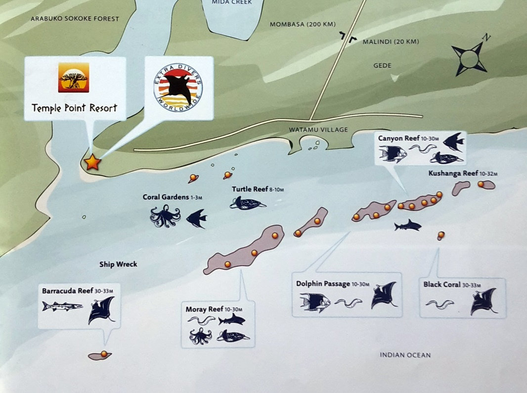 Temple Point's on-site dive center, Extra Divers, offers an exceptional gateway to Watamu’s underwater treasures. Catering to divers of all levels, the center provides a range of services, from guided dives to equipment rental and PADI certification courses. With expert instructors and a commitment to safety, the dive center ensures each adventure is both thrilling and secure. The proximity to Watamu’s 16 dive sites, coupled with the center’s knowledge of the local marine environment, allows divers to fully experience the vibrant coral reefs, diverse marine life, and unique dive opportunities, including drift and night dives.