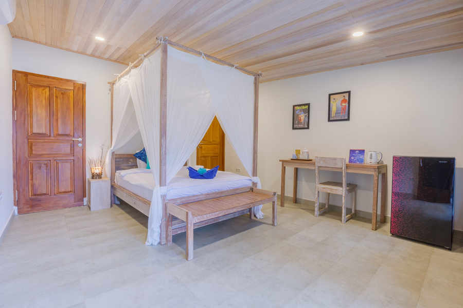 Each bungalow and single deluxe room includes a private bathroom, air conditioning, a fridge/minibar, and a private terrace. The bungalows also feature double or twin beds and a walk-in closet, while the single deluxe rooms have a shared veranda.