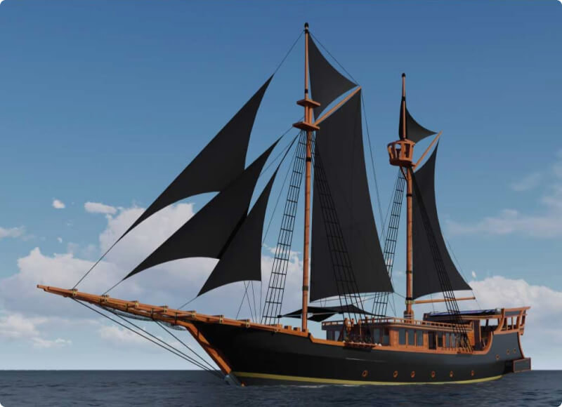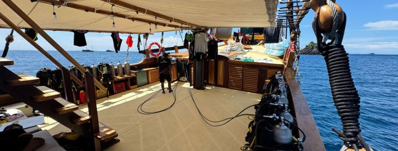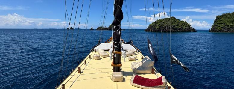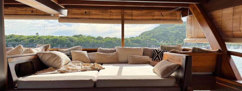 KLM Thalassa 42 is a newly built (2023–24) two-mast Phinisi hosting 6–8 guests in 3 ensuite cabins, purpose-built for exploratory routes in Indonesia.
