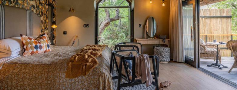 Discover serene luxury in our spacious suite, featuring a large leather sofa, outdoor shower, mini bar, and breathtaking views of the Thornybush landscape.
