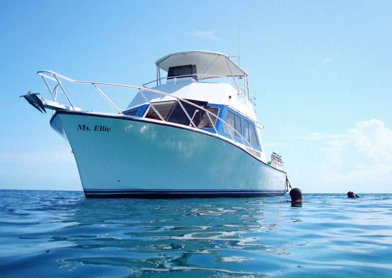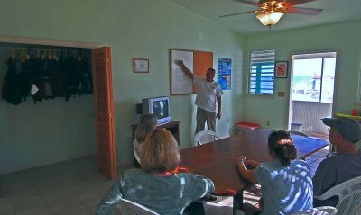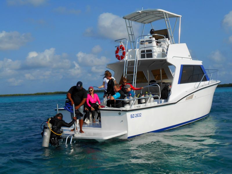 Following a delicious breakfast, a typical dive day begins at 8:00 AM and includes three boat dives. Depending on the dive location, we either return to the resort for lunch or pack a lunch. Traveling to the dive sites takes from ten minutes to an hour, with the longest trip being to the Blue Hole. On Blue Hole day we leave between 7:00 and 7:30 AM which often makes us the first boat there. The weekly night dive is usually on Wednesday evening. We generally dive the Elbow, at the Southern tip of Turneffe, later in the week. On Fridays, we do two or three dives depending on divers flights the following day.