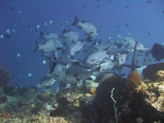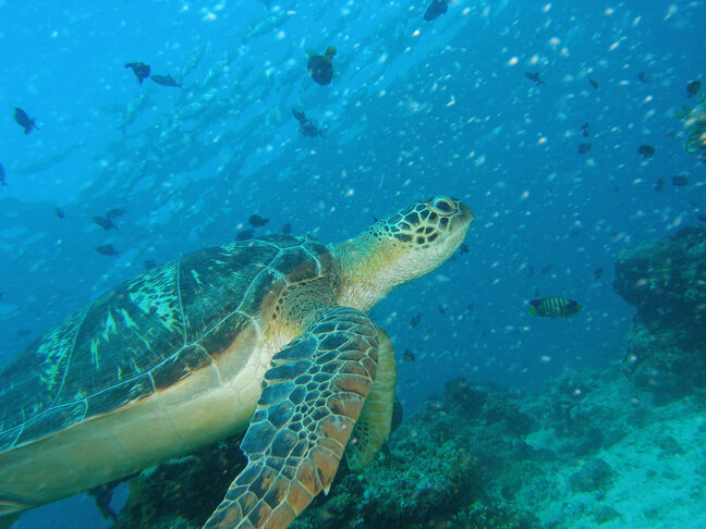 The dramatic drop-offs have a huge variety of soft and hard corals that offer a home to an abundance of reef fish such as fusiliers, butterflyfish, sweetlips, cardinal fish and damselfish. Turtles, barracudas and reef sharks call the reefs their home as well, and you can also find wall-critters such as scorpion fish, nudibranch, lionfish, and seahorses hidden on the walls.