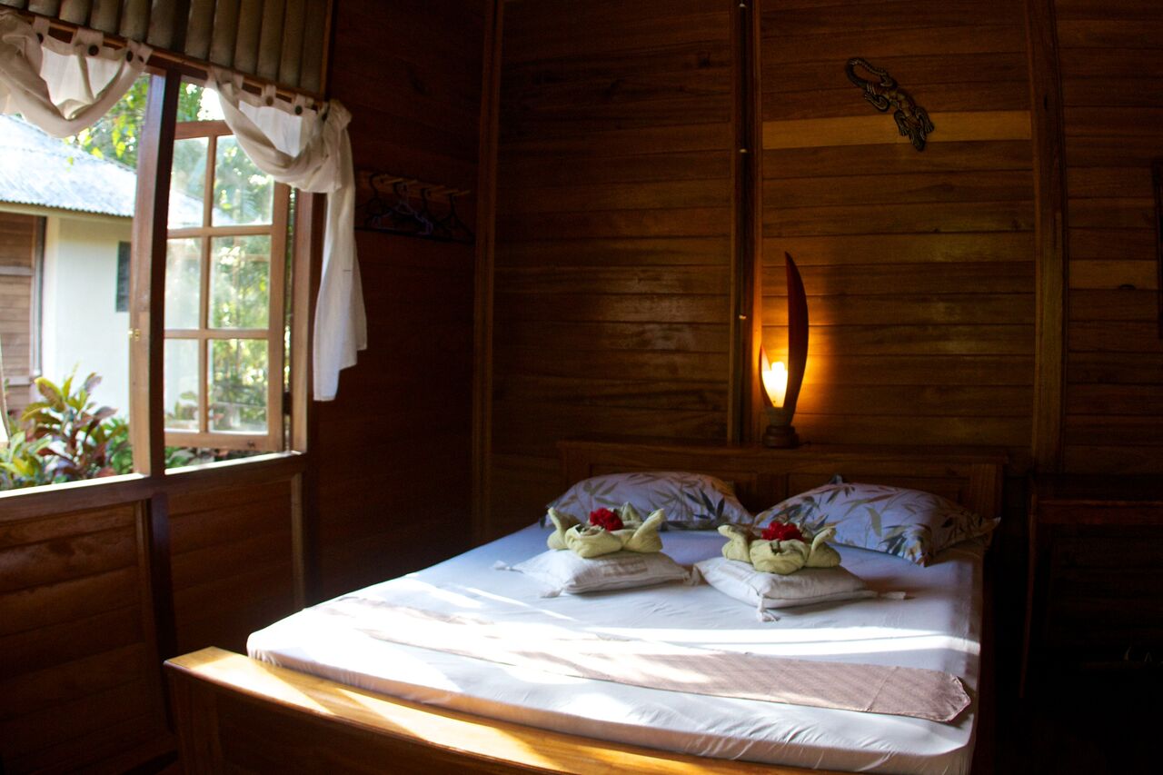 Newly renovated wooden cottage with garden or pool views, open-air bathroom, breezy doors, and cozy beds — ideal for relaxing after diving.