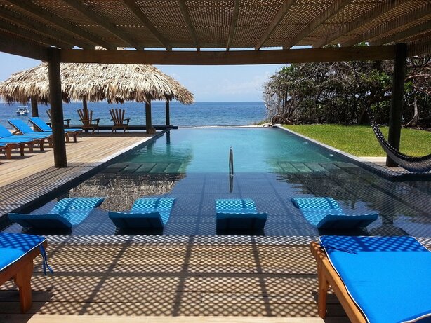 Naboo Resort in Roatán, Honduras, is a boutique eco-friendly retreat offering modern accommodations, lush surroundings, a stunning pool, and easy access to world-class diving and snorkeling.