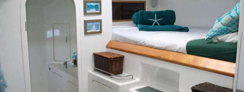 The Walkout Liveaboard features four Double Cabins, each with a private bathroom and shower, offering complete privacy for up to 8 guests. Each cabin is equipped with a queen-size bed, ample closet and storage space, a fan, and a stereo sound system, ensuring comfort and convenience.
