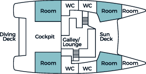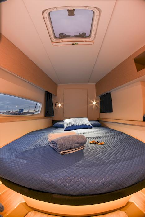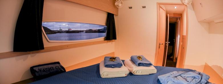 The Water & Wind vessel has 4 king-size bed suites with a dedicated bathroom each. Upon request, the beds can be also split into two single beds. Additionally, there are 2 rooms for crew, equipped kitchen, a lounge area, and a balcony. One of the rooms has a shared bathroom with the crew. The fully equipped kitchen has microwaves, a dishwasher, two fridges, and one freezer. Guests are provided with snorkel equipment and swimming ladders.