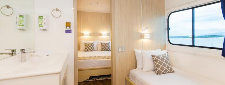The Yacht Solaris offers twelve twin cabins located on either the main deck or upper deck. Located on the main deck are five cabins are outfitted with a single bed and one cabin with a queen bed and a single. The cabins located on the upper deck feature a queen bed and a single bed, or a queen bed and a sofa bed. All the cabins include large panoramic windows with an ocean view and a private ensuite bathroom with hot and cold water.
