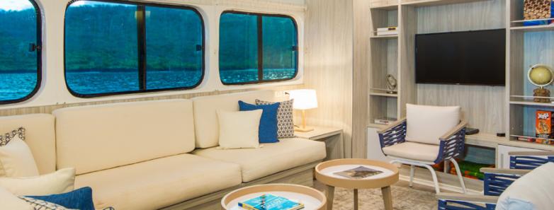The Upper Deck Cabins offer configurations with a queen bed and a single bed or a queen bed and a sofa bed, along with large panoramic windows and private ensuite bathrooms.